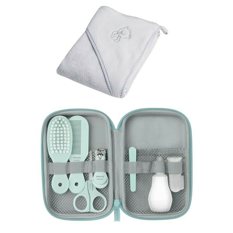 Set pentru igiena, Philips Avent: Aspirator nazal, Periuta de dinti pentru deget, Forfecuta, Unghiera, Pile, Pieptan si perie par + Prosop de baie din bumbac, Qmini, 80x80 cm, Gri