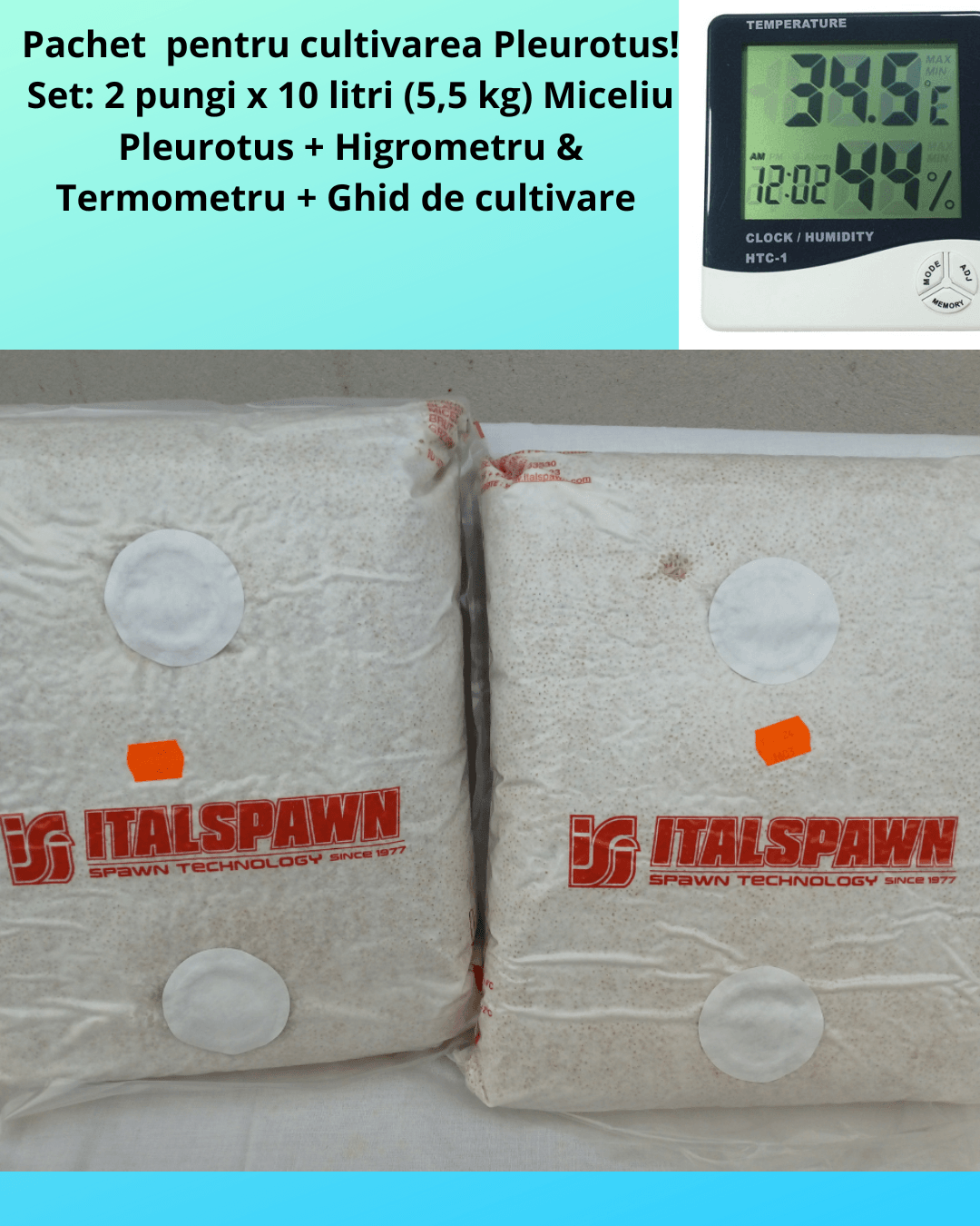 Set: 2 pungi x 10 litri ( Miceliu Pleurotus + Higrometru & Termometru + Ghid de Cultivare