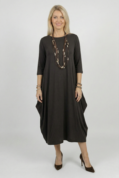 Rochie lunga maro cu colturi laterale, croiala lejera si design minimalist din tricot de vascoza