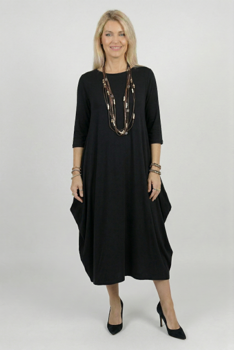 Rochie lunga neagra cu colturi laterale, croiala lejera si design minimalist din vascoza