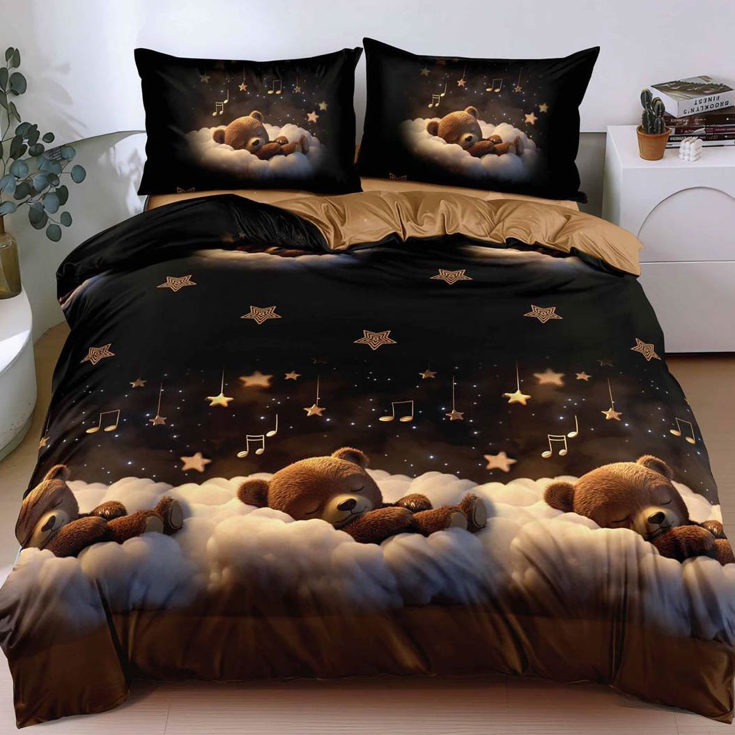 Lenjerie pat dublu, bumbac satinat, cearsaf clasic, 4 piese, Negru, Maro, ursuleti