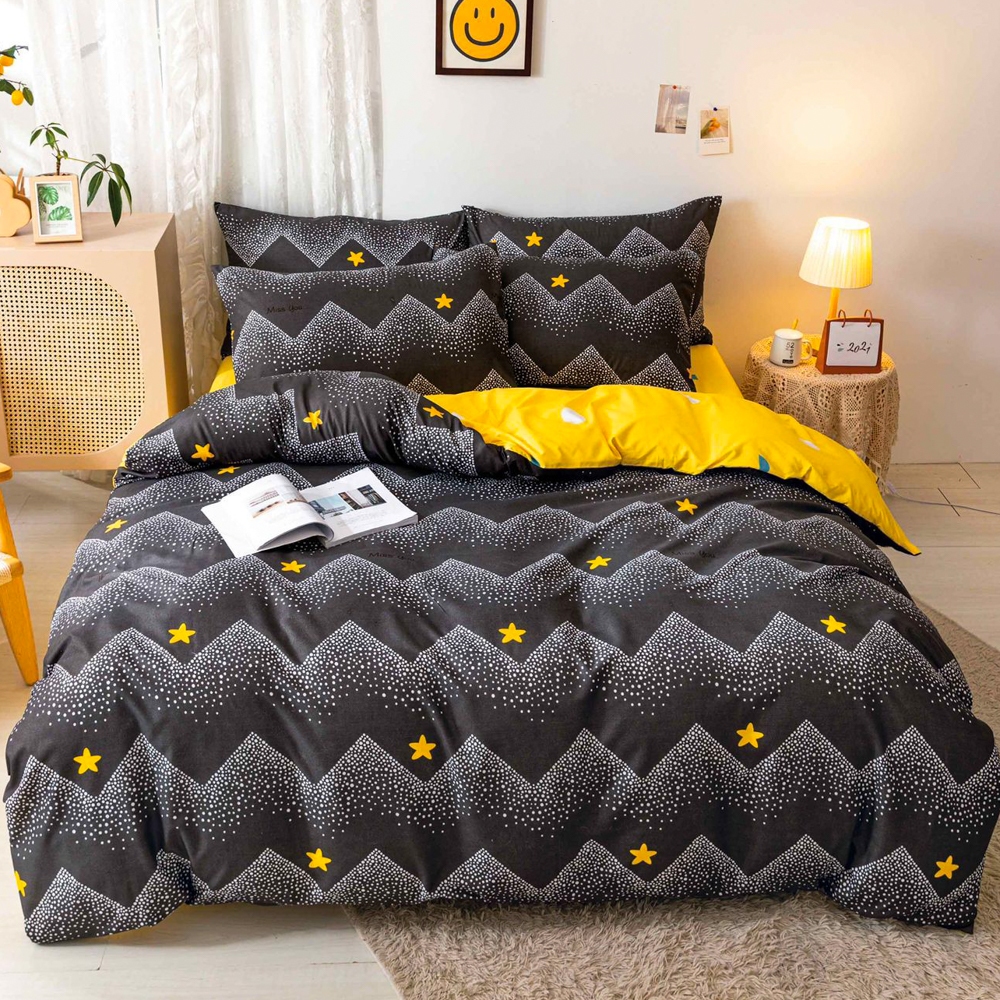 Lenjerie pat dublu, bumbac satinat, cearsaf clasic, 4 piese, Negru, Galben, stelute