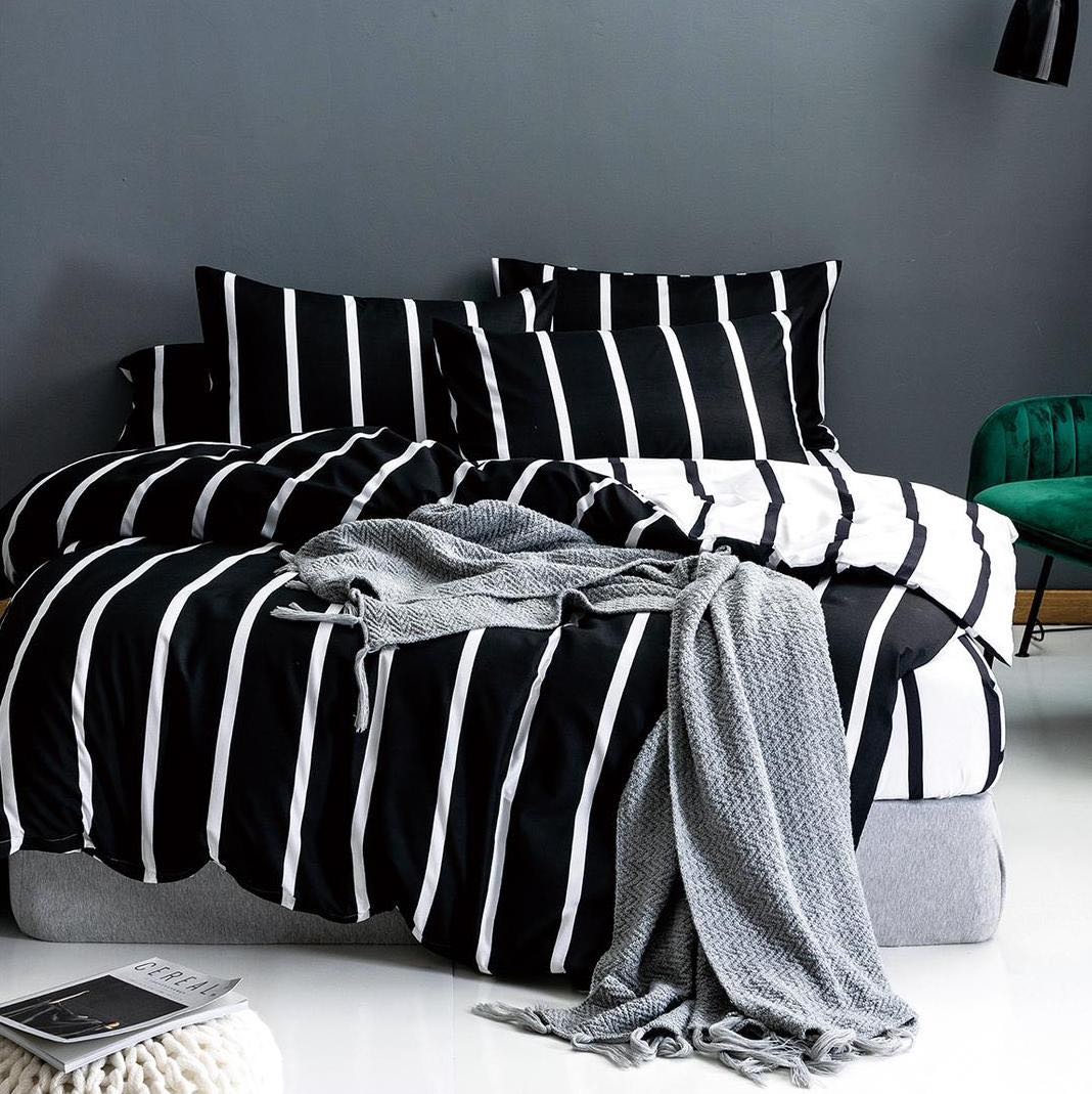 Lenjerie pat dublu cu Elastic, bumbac satinat, Alb, Negru, dungi