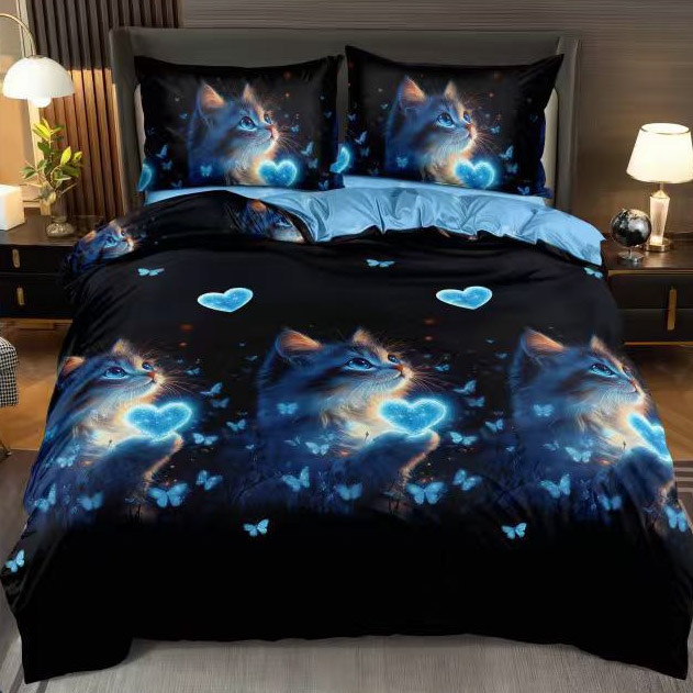 Lenjerie pat dublu, bumbac satinat, cearsaf clasic, 4 piese, Negru, Albastru, pisicute si inimioare